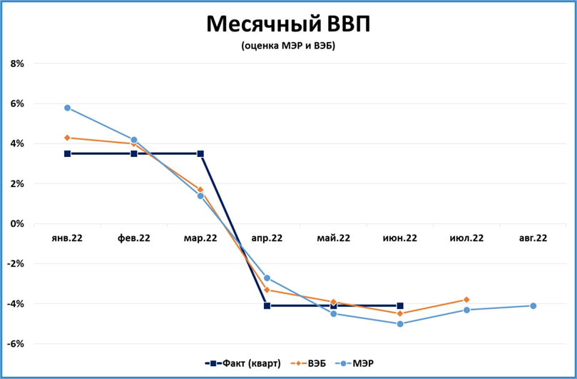 ● Это значит, что падение ВВП в 3 и 4 кварталах должно ускориться, но этого не происходит. По предварительным оценкам МЭР, ВЭБ и других организаций, считающих ВВП в месячном исчислении, падение ВВП в июле и августе не ускоряется, а замедляется по сравнению со 2 кварталом.