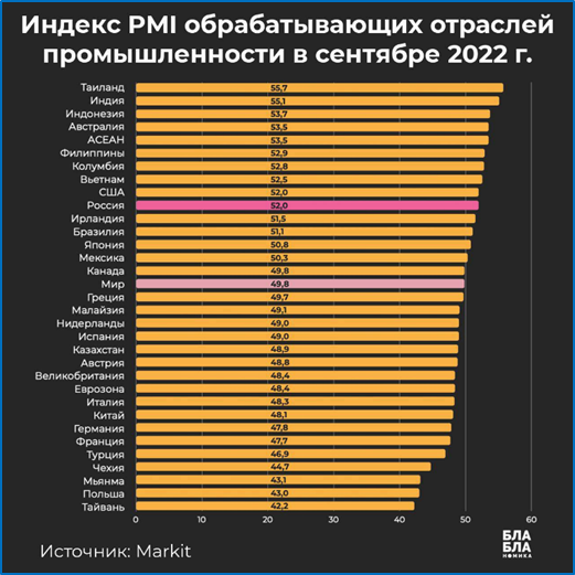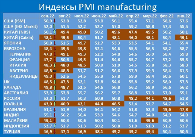 Деловая активность в обрабатывающей промышленности по итогам сентября опустилась ниже 50 пунктов более, чем в 10 странах из приведённых в таблице – это максимум с апреля 2020 года.