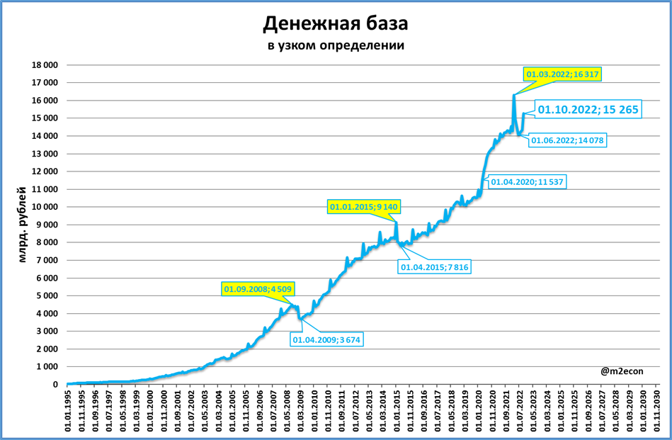 Узкая денежная база (УДБ) превысила 15 трлн. рублей впервые после всплеска в феврале-марте.