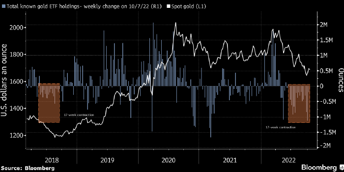 Цены на золото закрыли снижением уже шесть месяцев подряд, потеряв за это время примерно $250 за унцию. Период агрессивного повышения процентных ставок ведущими центробанками мира — не лучшее время для покупки драгметаллов, поэтому неудивительно, что капитал продолжает покидать инструменты этого рынка.