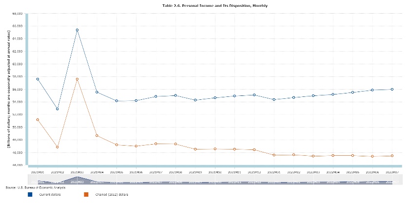 Замедление общей инфляции в США связано практически лишь с продолжающимся второй месяц снижением цен на бензин (-10,6% (м/м)), вследствие чего темп роста цен на энергоресурсы замедлился с 32,9% (г/г) в июле до 23,8% в августе. Снизились также цены на авиабилеты, связь, подержанные автомобили. Однако повышенные темпы инфляции распространяются по экономике широким фронтом — основной вклад в инфляцию внесли рост цен на пользование жильем, продовольствие, медицинские услуги. Также повышенные темпы инфляции отмечались в товарах для дома, новых автомобилях, страховках на автомобили. Месячный рост цен на продовольствие (+0,8%) стал минимальным с декабря прошлого года, однако за 12 месяцев он обновил рекорд с 1979 г. (+11,4%).