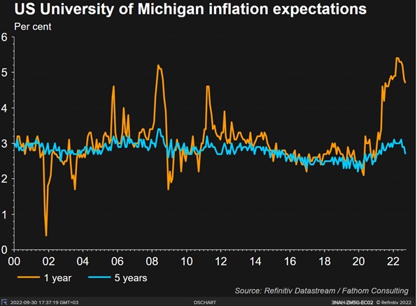 В качестве некоторого позитива можно отметить снижение цен на бензин в США примерно на 20% от пиковых значений июня, два месяца сокращения (по 0,1% (м/м)) индекса цен производителей, а также более заметное снижение импортных цен (на фоне укрепления курса доллара). Важно также, что инфляционные ожидания потребителей, по данным опроса Мичиганского университета, в конце сентября снизились, и на горизонте 1 года достигли 4,7% (минимум за год) по сравнению с 4,8% в августе, на долгосрочную перспективу (5-10 лет) — до 2,7% (впервые с июля прошлого года опустившись ниже 2,9%). Опрос ФРБ Нью-Йорка фиксирует, что в августе медианные инфляционные ожидания населения продолжили снижение — на горизонте 1 года они опустились с 6,2% в июле до 5,75% (минимум с октября 2021 г.), а на 3-летнем горизонте снизились с 3,2% до 2,8% (минимум с конца 2020 г.). Хотя кратко- и среднесрочные ценовые ожидания остаются на повышенном уровне, важно, что на 5-летнем горизонте опрошенные уже верят в снижение инфляции до 2% (что соответствует таргету ФРС), в то время как на начало года их оценка составляла 3%, а в июле — 2,35%.