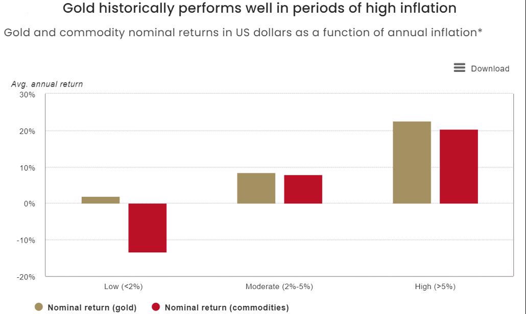 Считается, что золото превосходит в динамике другие товары в периоды более высокой инфляции, чего на этот раз пока не произошло. Однако анализ, проведенный World Gold Council показывает, что золото отстает от других товаров в инфляционные периоды, обусловленные сырьевыми товарами, и догоняет и опережает в последующие 12-18 месяцев.