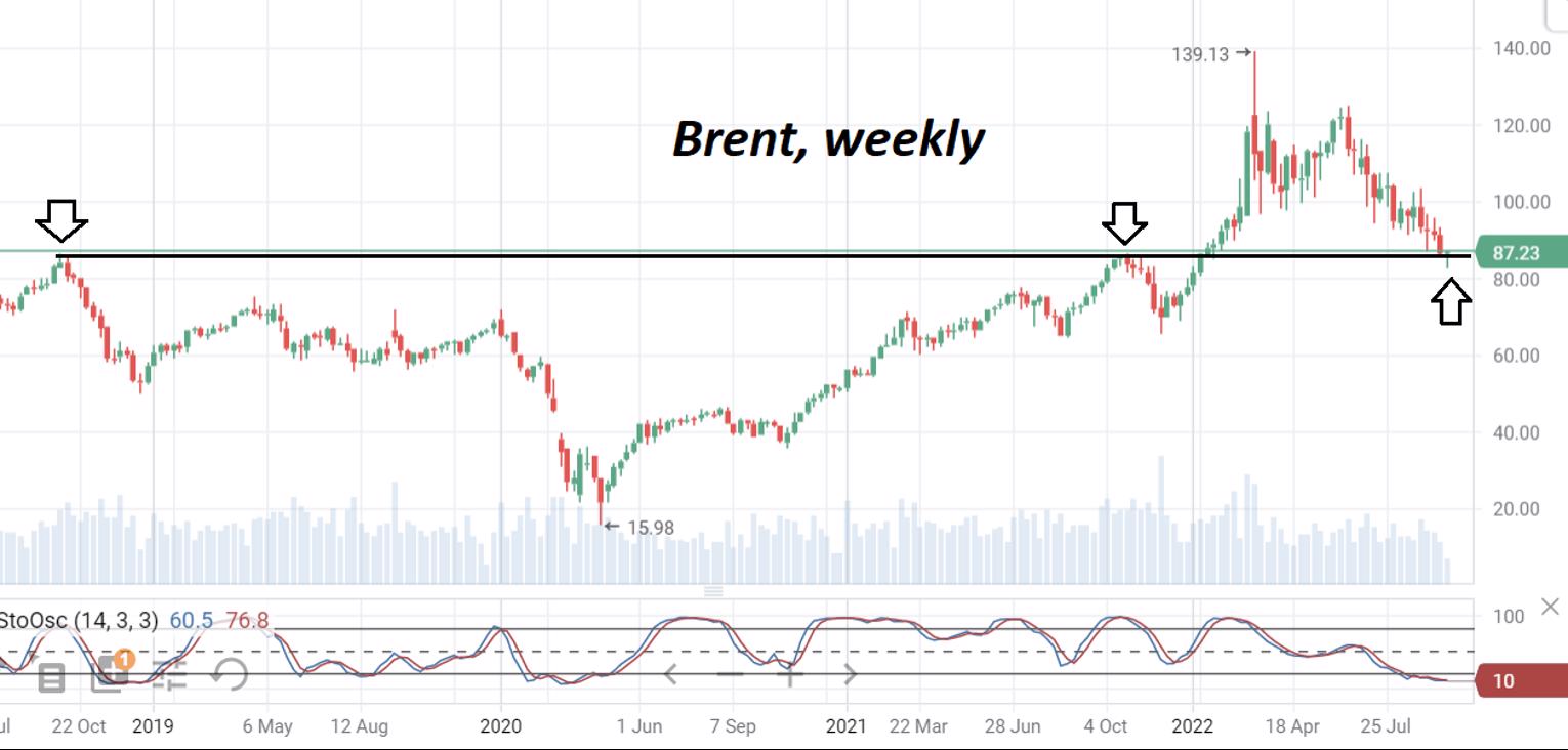 Техническая картина. Как мы видим на недельном графике, нефть марки Brent в середине сентября опустилась в район $85/барр. На этом рубеже проходит сильный горизонтальный уровень поддержки — ранее здесь были максимумы осени 2021 г. и осени 2019 г. Риски прихода рецессии в мировую экономику — это среднесрочный фактор, который будет продолжать давить на нефть. Но с текущих уровней вполне возможен отскок наверх в район $100/ барр., особенно если ОПЕК решит существенно сократить квоты на добычу.