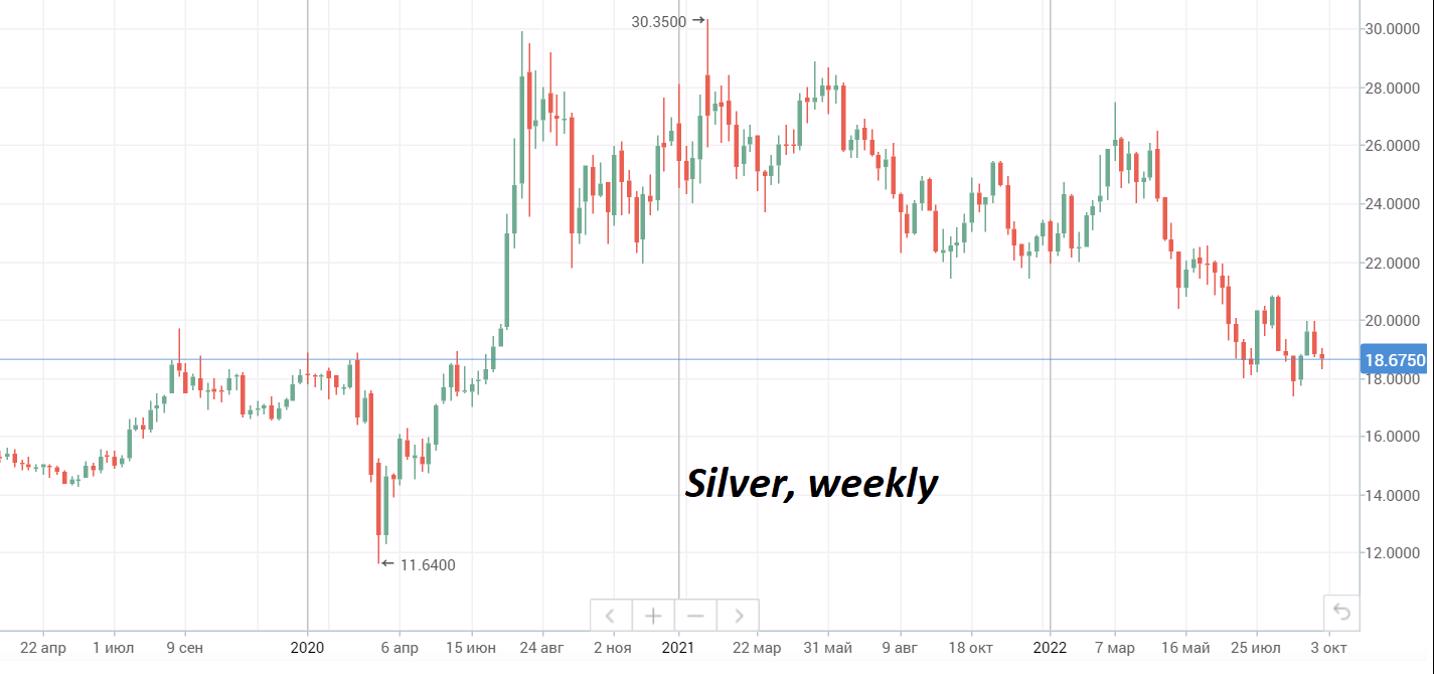 Как видим, просадка цен на серебро в этом году имеет место, но она просто вернула цены с повышенных уровней 2021 г. на более низкие. Район $17-19/унц. — это хорошая поддержка, ранее серебро провело в этом диапазоне всю вторую половину 2019 г. Тот факт, что серебро прекратило падать в цене даже в сентябре, когда ведущие центробанки подняли ставки, говорит о сохранении спроса на белый драгметалл на текущих уровнях. Из поддержки в районе $18/унц. серебру, возможно, удастся позднее показать хорошую волну восстановления цен (обычно январь и февраль бывают для драгметаллов сильными месяцами).