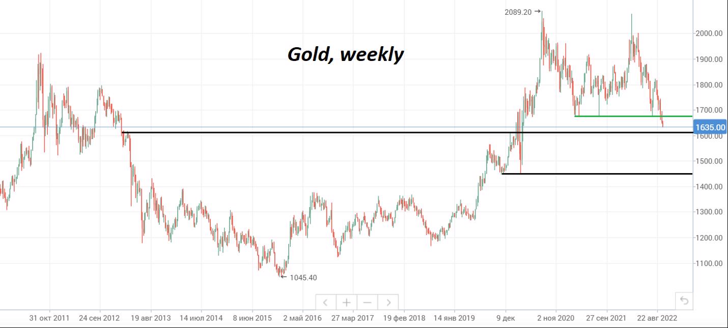 Техническая картина. Активное падение цен на золото идет уже 6 месяцев подряд. С годового максимума ($2075/унц.) драгметалл потерял в цене уже более 20%. В настоящий момент золото торгуется на $1625/унц. — это минимальный уровень с начала апреля 2020 г. Как видим, в сентябре котировки золота пробили значимый уровень годовой поддержки на $1675/унц. И теперь, судя по графику, следующей целью снижения может стать район $1610/унц. Но поскольку техническая картина пока остается слабой, а мировые центробанки собираются и дальше продолжать повышать ставки, то среднесрочной целью по золоту может стать район $1450/унц.