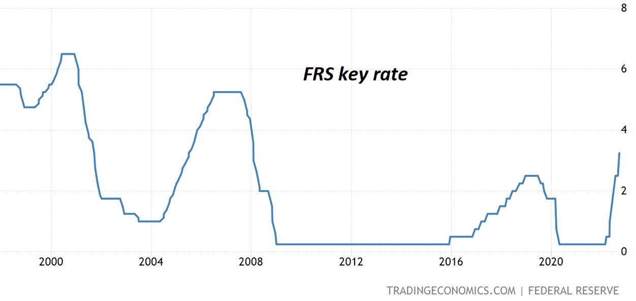 Высокие цифры по потребительской инфляции в США укрепляют мнение инвесторов о том, что ФРС будет продолжать повышать процентные ставки до конца 2022 г. с выходом в район 4,4%. Это будут самые высокие уровни ключевой ставки с конца 2007 г., то есть как раз накануне предыдущего глобального кризиса.