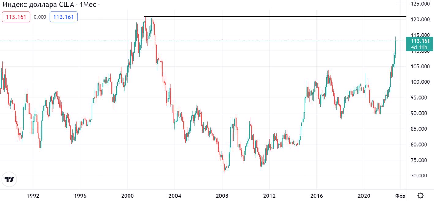 Индекс доллара. С начала этого года индекс DXY, который оценивает стоимость доллара к корзине иностранных валют (EUR, JPY, GBP, CHF, CAD и SEK), вырос на 18%, достиг отметки 114 п., обновив уровни 20-летних максимумов.