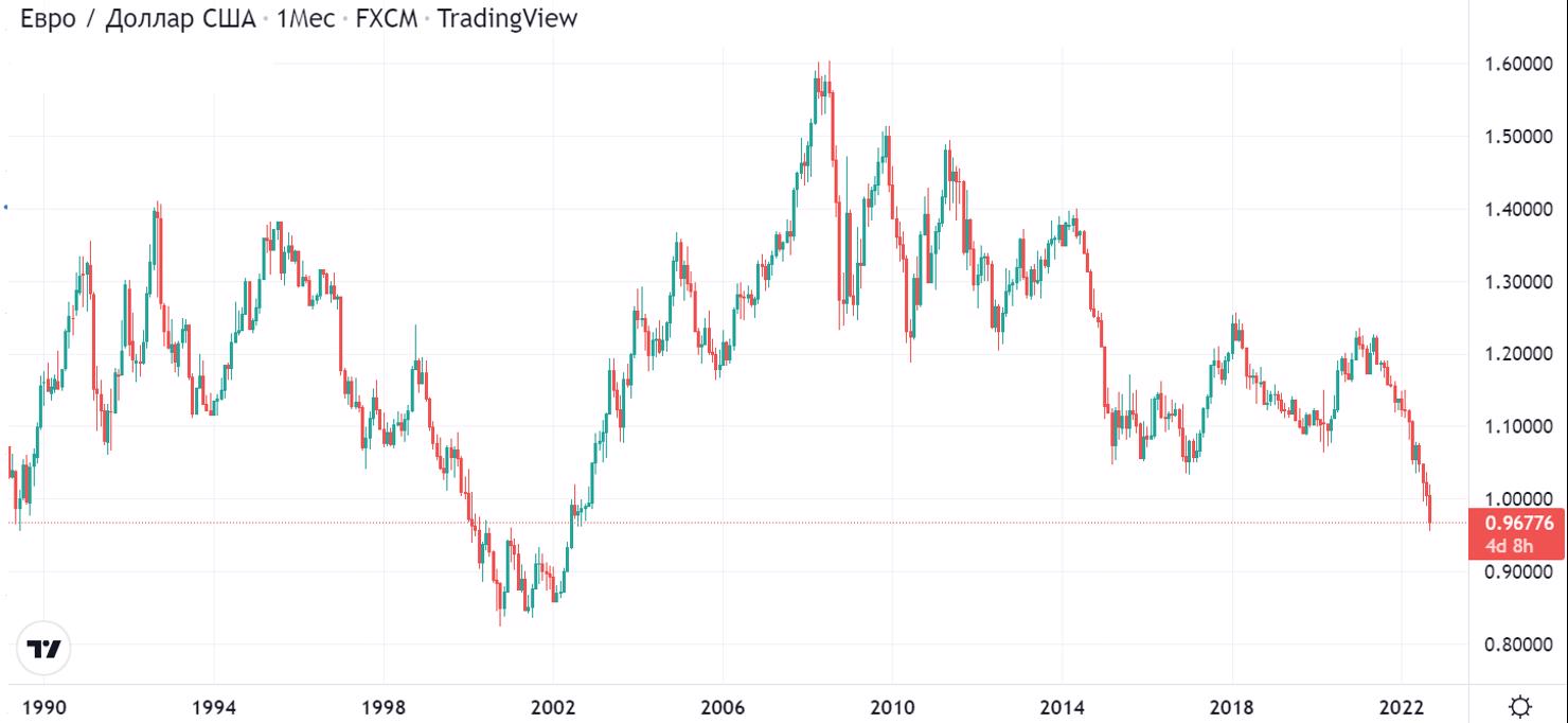Техническая картина. На месячном графике курса евро к доллару видно, что он падает уже 14 месяцев из 16 последних. Очевидно, что перекупленность вскоре начнет тормозить дальнейшее ослабление курса европейской валюты. Однако после локальной коррекции ослабление позиций евро может быть продолжено с перспективой снижения курса до 0,95 к доллару. Однако в случае усиления негативных тенденций в экономике еврозоны зимой 2022-2023 гг. позиции евро вполне могут опуститься до минимумов 20-летней давности в районе 0,9-0,85 к доллару, но это, скорее, перспектива весны 2023 г.