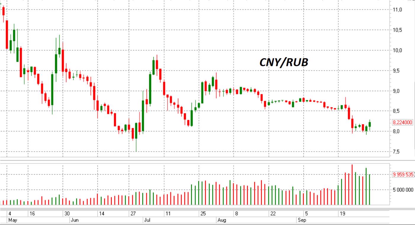 В конце сентября мы видели резкий рост волатильности по курсу доллара и евро относительно рубля. Причина такой динамики этих валют в том, что участники рынка очень нервничали, поскольку в ответ на присоединение восточных частей Украины к России, страны Запада пообещали усилить санкционное давление на РФ. Не исключено, что могут быть введены санкции против НКЦ, которая находится в структуре Московской биржи. В этом случае биржевые торги долларом и евро окажутся под запретом. Поэтому участники рынка предпочитали избавляться от этих валют, переводя средства в китайский юань.