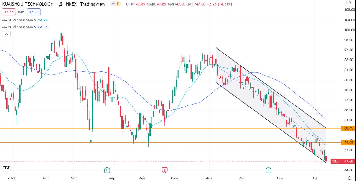 Акции Kuaishou выглядят существенно перепроданными относительно SMA 20 и SMA 50. Последние несколько месяцев в акциях наблюдается более сильная просадка, чем в целом по гонконгскому рынку. Не исключаем, что при улучшении конъюнктуры акции могут выглядеть лучше рынка и показать более сильный отскок. Текущая техническая картина не исключает разворота у нижней границы нисходящего канала с последующим ростом до уровня HKD 55.