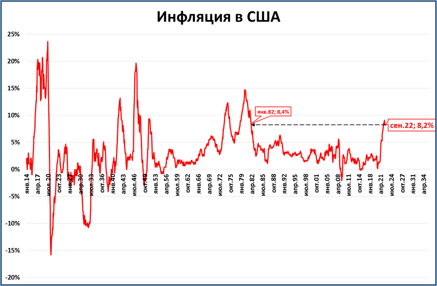 Первая причина – нерешительное повышение ставки федеральным резервом. Ставка сейчас (3,25%) намного ниже инфляции (8,2%).
