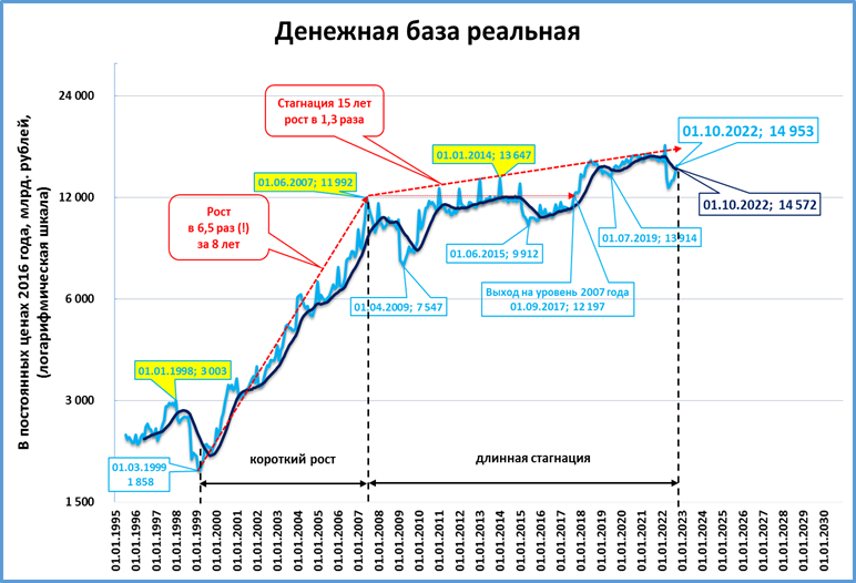 Тем не менее, реальная денежная база сейчас отстаёт даже от той стагнационной динамики, которая стала обычной за последние 15 лет, то есть с 2007 года.