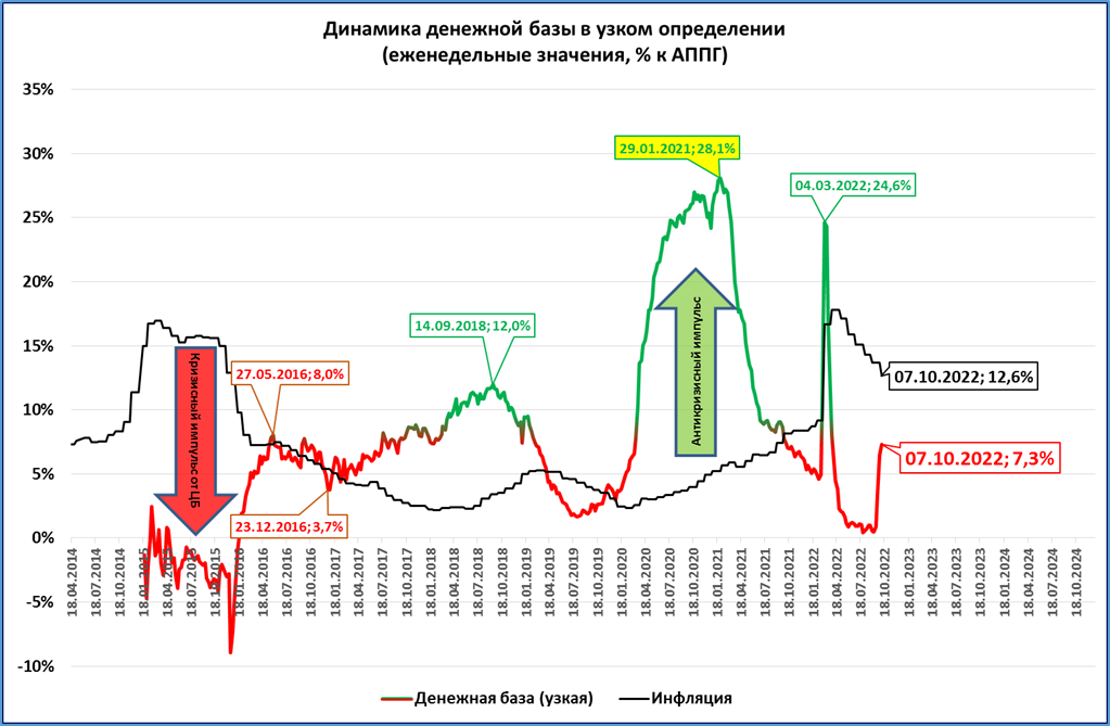 Другое дело, что происходит это не благодаря осознанным действиям ЦБ, а большим суммам наличных, которое население снимает в последнее время. Само по себе это денежную базу не увеличивает. Но это уменьшает резервы банков, и они вынуждены брать кредиты в ЦБ, что и ведёт к росту денежной базы.
