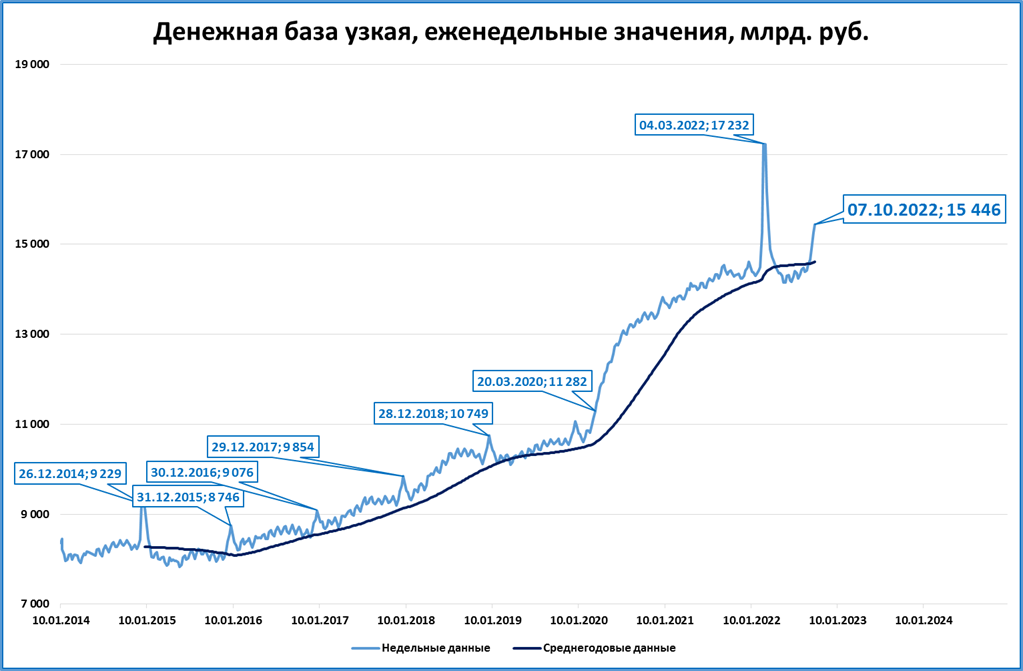 На 7 октября узкая денежная база (УДБ) выросла до 15,4 трлн рублей.