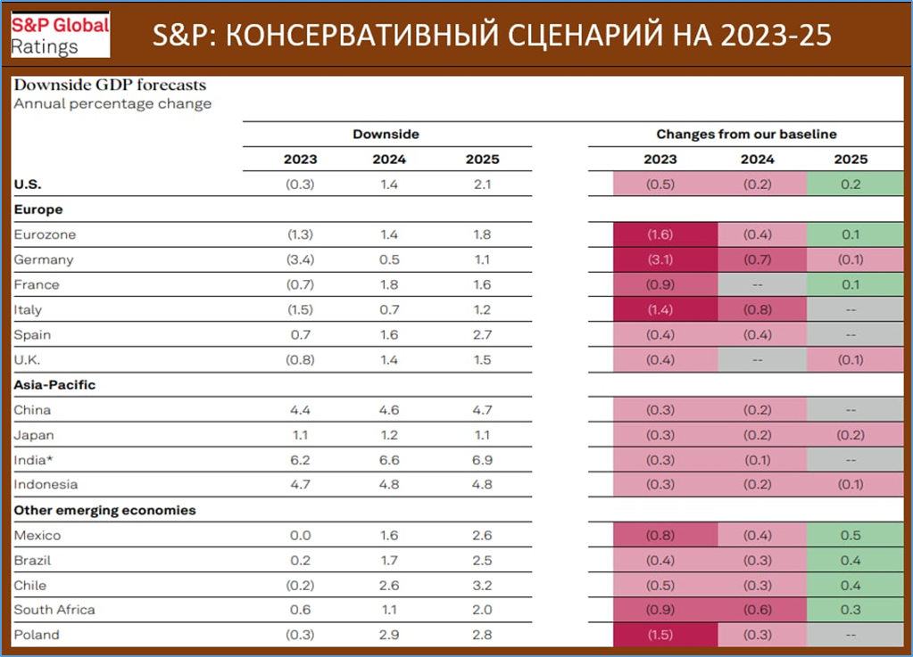 Рейтинговое агентство S&P Global в своём консервативном прогнозе на 2023 год предполагает падение ВВП США, Еврозоны и Британии.