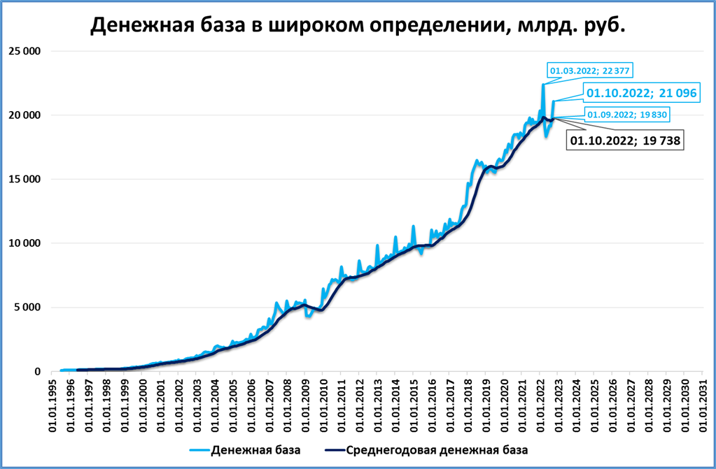По данным ЦБ, опубликованным 14 октября, широкая денежная база (или просто ДБ) на 1 октября составила 21,1 трлн. рублей – это второй лучший результат после 1 марта 2022 года.