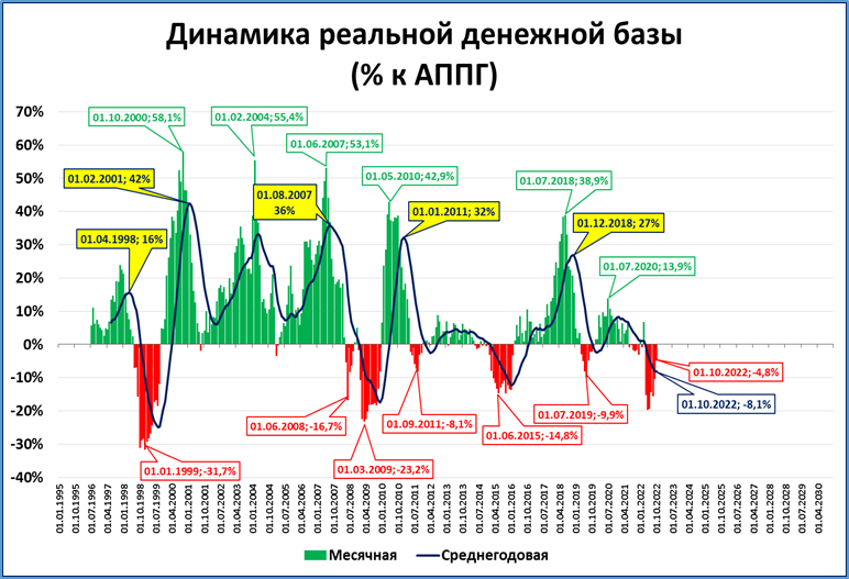Но есть и позитивный момент: нынешние темпы падения (-4,8%) меньше, чем средние темпы падения за последние 12 месяцев (-8,1%). Это значит, что падение реальной ДБ замедляется.