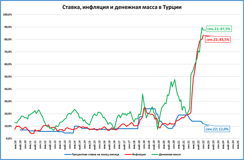 ● Несмотря на высокую инфляцию в Турции (83%), денежная масса растёт ещё быстрее, а значит соблюдается главное условие роста экономики.