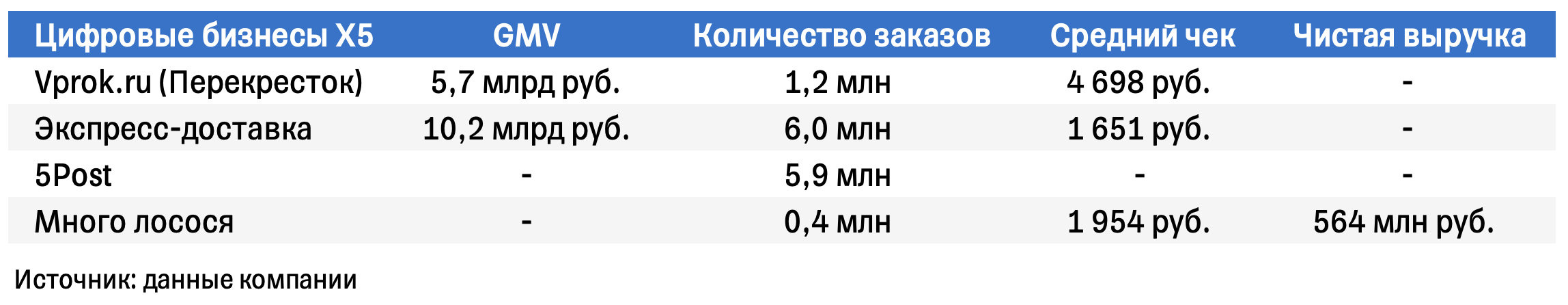 Совокупный товарооборот в онлайн-магазинах (GMV) Vprok.ru и сервисов экспресс-доставки вырос на 36% г/г (до 15,9 млрд рублей). Больше всего товарооборот вырос у сервисов экспресс-доставки — на 51,8% г/г. Х5 продолжает развивать онлайн-направление. Так, в августе компания начала сотрудничать с крупнейшими сервисами доставки продуктов и готовой еды — СберМаркет и Delivery Club.