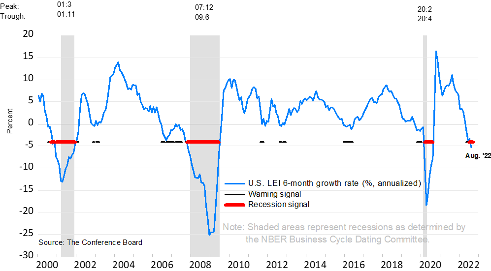 6-месячная динамика индекса LEI в августе продемонстрировала четкий сигнал о будущей рецессии. Пик индекса пришелся на декабрь 2021. В семи предыдущих «классических» рецессиях пик LEI опережал пик бизнес-цикла на 9-22 месяца (медиана 12, среднее 13,7). Таким образом, высока вероятность, что уже этой зимой экономика США покажет первое падение занятости.