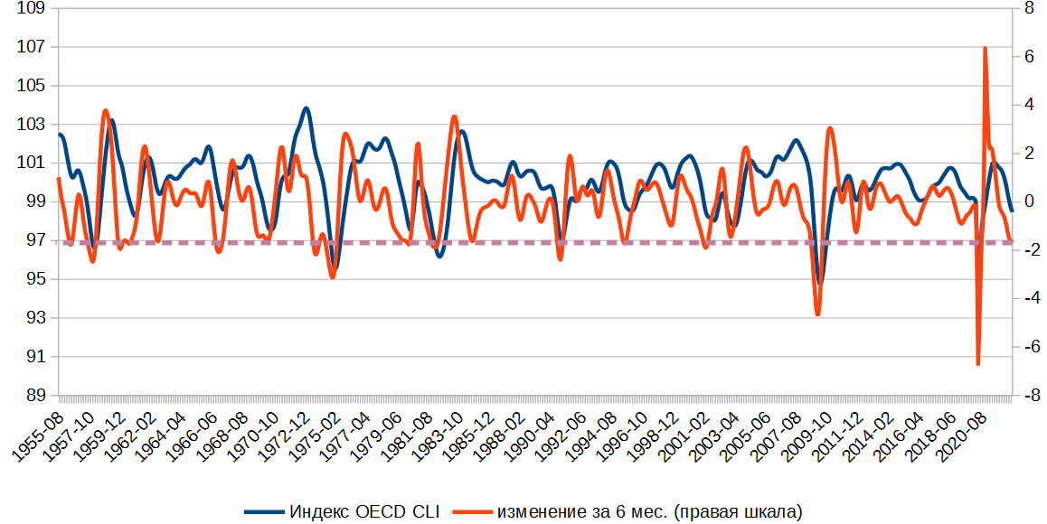 Еще один, аналогичный индекс вычисляет ОЭСР. Его значения очищены от трендовой составляющей, что делает его не таким наглядным. Но из этого тоже можно извлечь пользу.