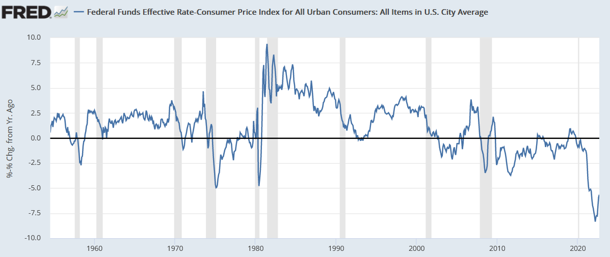 Впрочем, можно возразить, что инфляция тоже поднялась резко и далеко обогнала учетную ставку. Это привело к тому, что текущая реальная учетная ставка до сих пор находится на рекордно отрицательном уровне за всю современную историю Штатов. Другими словами, для реального сектора монетарная политика все еще остаётся рекордно мягкой:
