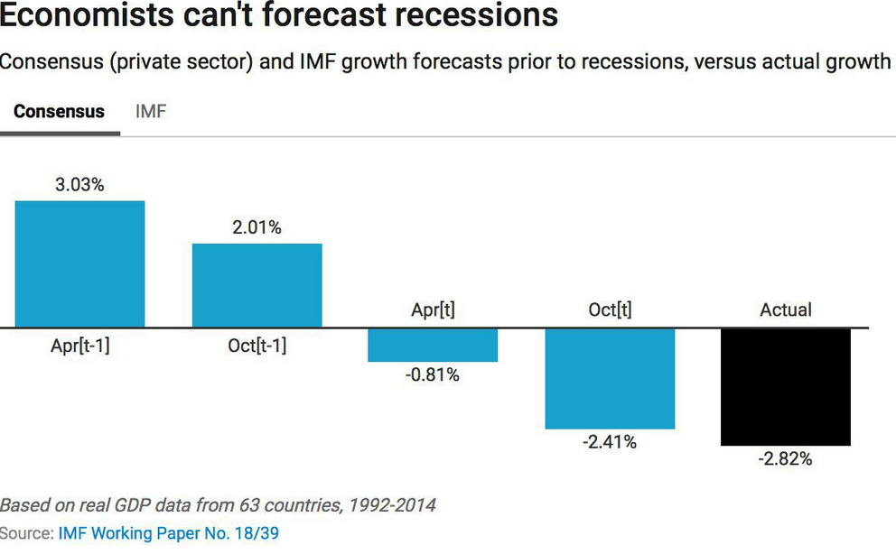То, что консенсус не умеет прогнозировать рецессию — уже давно устоявшаяся традиция, что подтверждают 2007 и 2001 год. Характерной частью этой традиции является попытка предсказывать рецессию при помощи синхронных и даже запаздывающих индикаторов.