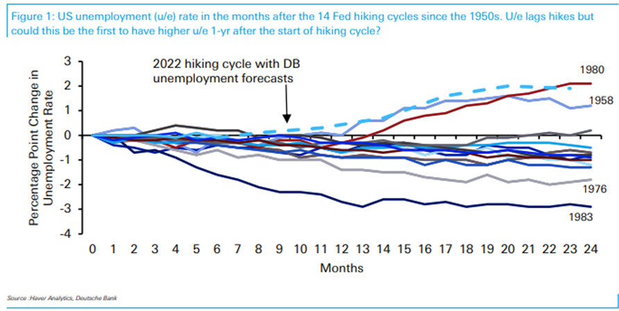 ...экономика не торопится охлаждаться, добавляя всё больше рабочих мест. Более того, обратившись к истории предыдущих циклов монетарного ужесточения, аналитик «Дойче Банк» Джим Рид указывает на то, что ни один из них не привёл к росту безработицы через 12 месяцев после первого поднятия ставки. В 12 из 13 циклов безработица через год была даже ниже. Это говорит о том, что в реальности ФРС очень трудно воздействовать на динамику спроса реального сектора, по крайней мере в краткосрочной перспективе.