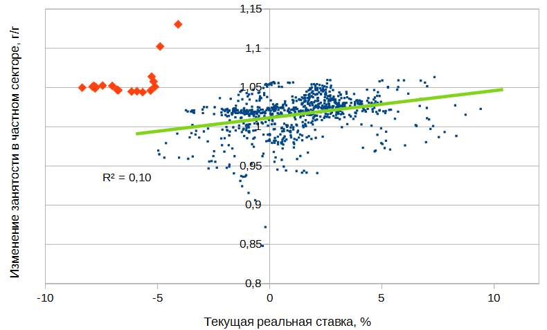 Разброс значений подтверждает тезис о том, что монетарная политика оказывает очень ограниченное влияние на занятость.