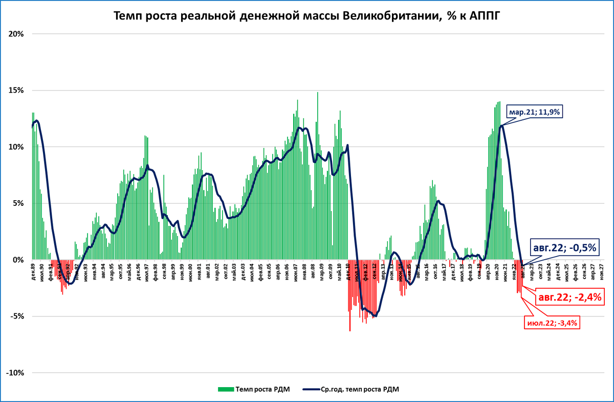 Денежная масса в Британии с февраля растёт медленнее цен, что прямо ведёт к рецессии.