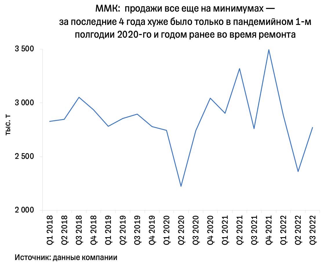 Они отняли рыночную долю у ММК. У этого сталевара объемы продаж все еще на минимумах последних лет. Меньше были только в первой половине 2020 года и в третьем квартале 2021-го, когда на производстве велись ремонтные работы.
