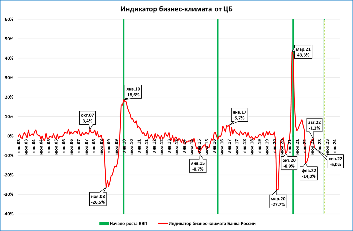 В прошлом примерно через 13 месяцев после низшей точки по темпам индикатора начинался рост ВВП. Если ситуация повторится, то рост ВВП можно ожидать с апреля 2023 года.