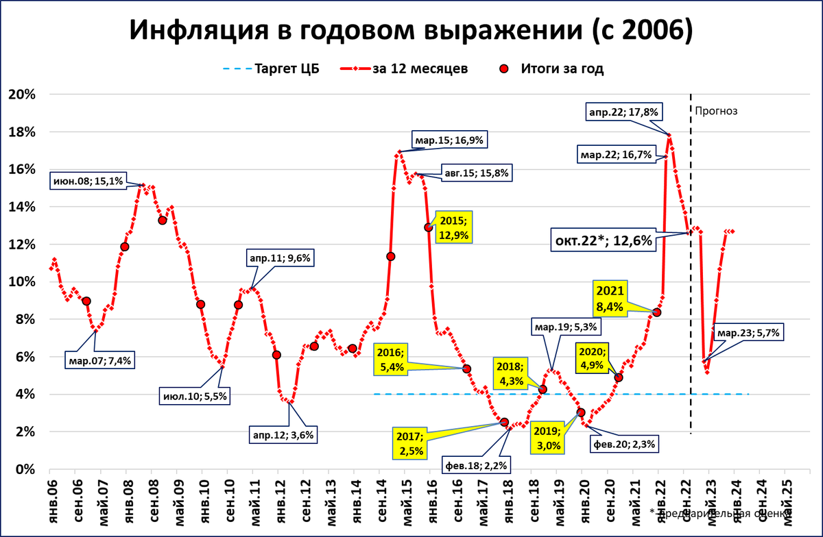 А уже по итогам декабря (что совпадёт с инфляцией за весь 2022 год) инфляция резко снизится, так как рост цен в декабре 2021 года в расчёте участвовать уже не будет.