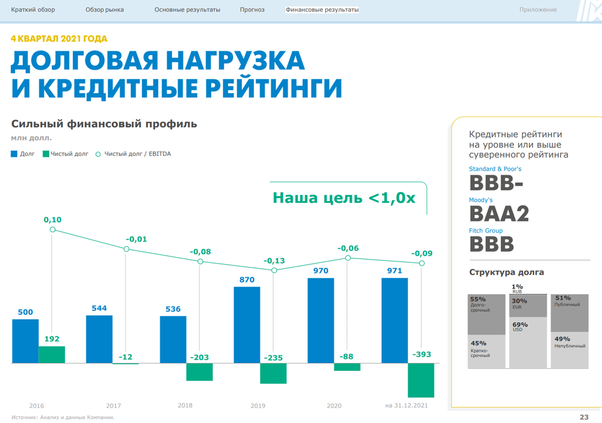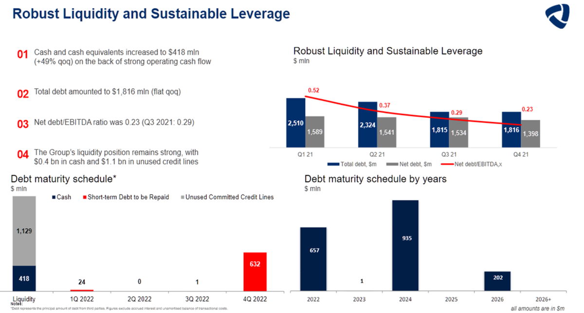 У Северстали ND/EBITDA = 0,23. Чистый долг составлял 1,4 млрд долларов. По графику платежей видно, что 0,6 млрд долларов нужно будет погасить в 4 квартале 2022 года, а в следующем году платежей не планировалось.