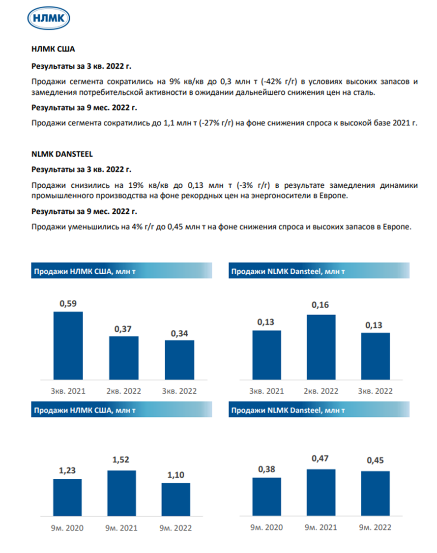 Также НЛМК опубликовала результаты продаж своих предприятий в США и Дании. Видим, что продажи сократились как за третий квартал, так и по итогам девяти месяцев. Но совокупная доля продаж в этих регионах составляет 12% от общих продаж компании.
