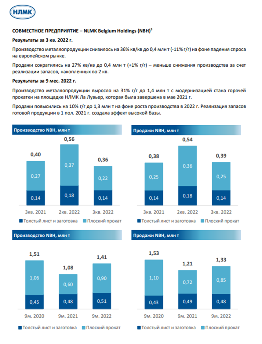 Ещё у НЛМК есть половина доли в совместном бельгийском предприятии. В нём результаты за третий квартал были слабее, чем в предыдущем квартале на фоне падения спроса на европейском рынке. Но по итогам девяти месяцев зафиксирован рост производства на 30% и рост продаж на 10%.