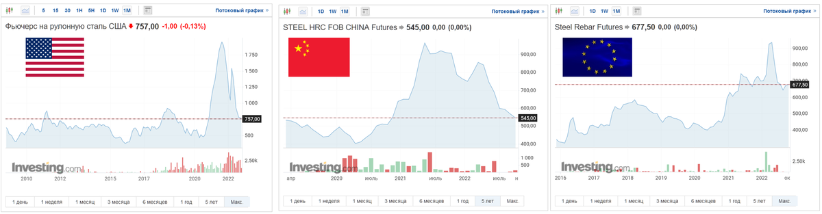 Только в Европе фьючерсные цены на стальную арматуру пока упали не так сильно. Этот эффект возник из-за санкций и ограничений поставок продукции российских металлургов. Но в любом случае, и здесь цены упали уже на треть от максимумов.