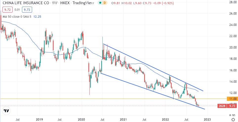 С точки зрения технического анализа на недельном графике акции China Life класса H консолидируются вблизи нижней границы среднесрочного нисходящего канала. Ожидаем формирования отскока, ближайшей целью которого может стать район HKD 11.