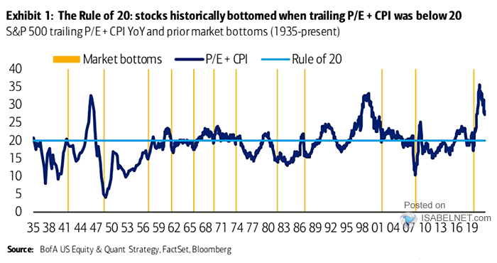 В частности, аналитики Bank of America отмечают, что предыдущие низы рынка акций всегда совпадали с периодами, когда сумма отношения P/E (на будущие 4 квартала) и инфляции была ниже 20: