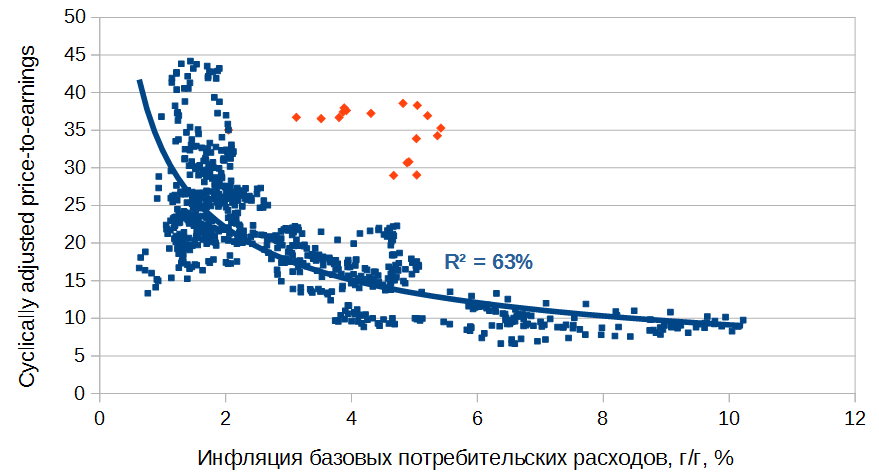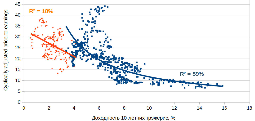 Наглядной иллюстрацией может быть историческая связь доходности 10-летних трэжерис и очищенного от цикла соотношения price-to-earnings:
