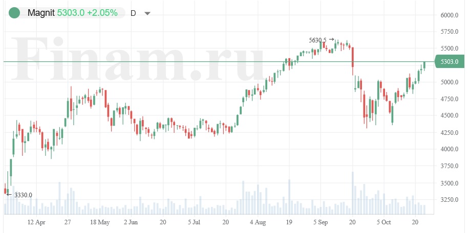 Акции «Магнита» сегодня дорожают на 1,94%, до 5297,5 рубля.