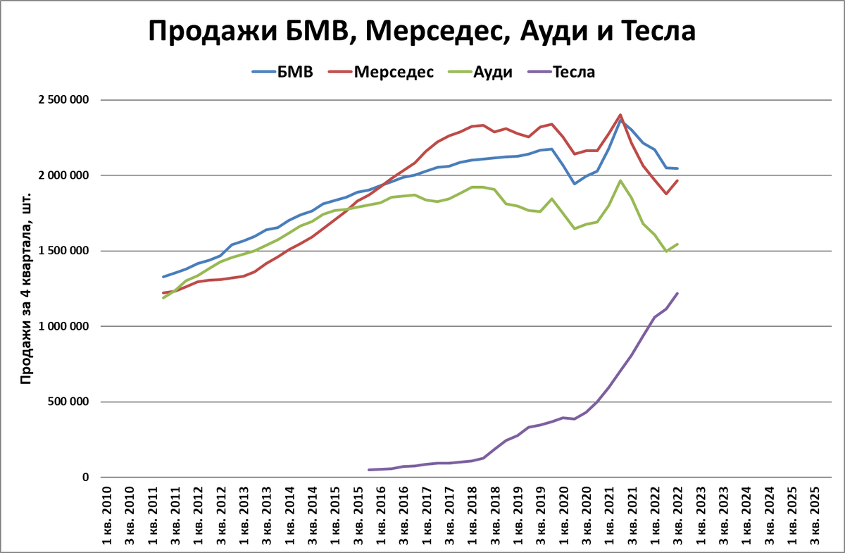 В 3 квартале 2022 года четыре премиум-бренда (БМВ, Мерседес, Ауди и Тесла) продали без малого 1,8 млн. автомобилей.