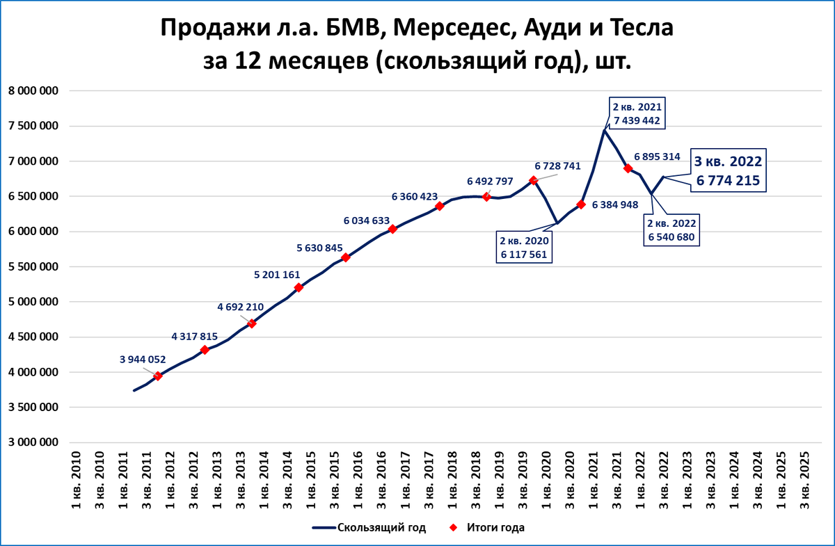 Напомним, что рекордными четырёхквартальные продажи стали по итогам 2 квартала 2021 года (7,4 млн.), после чего началось падение.