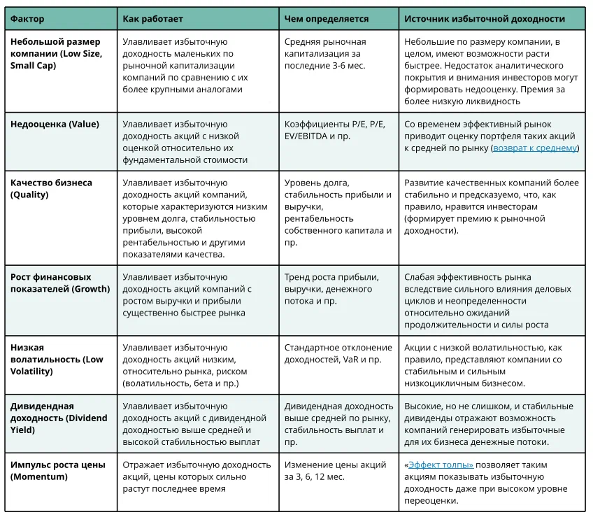 Инвестиционные факторы и источники избыточной доходности, связанной с этими факторами. Источник: УК ДОХОДЪ