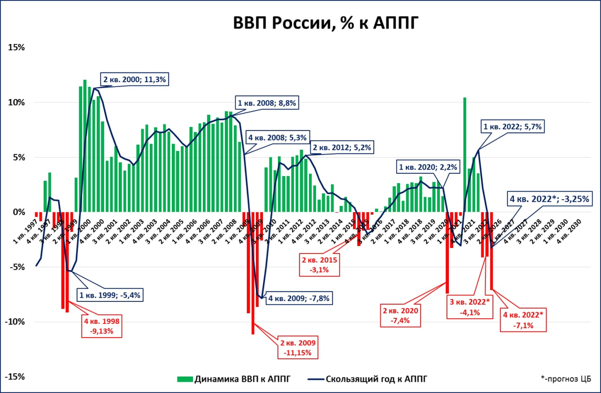 На следующий день, в пятницу 28 октября, Эльвира Набиуллина озвучила новый прогноз ЦБ, по которому ВВП в 4 квартале 2022 года упадёт на 6,4-7,8% (середина прогнозного диапазона -7,1%).