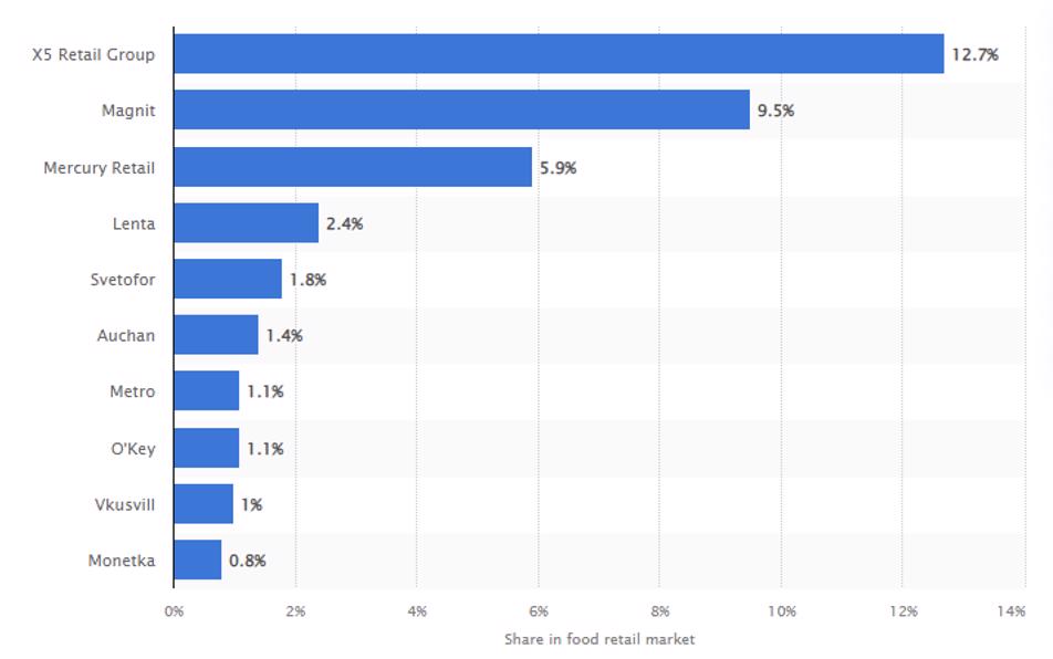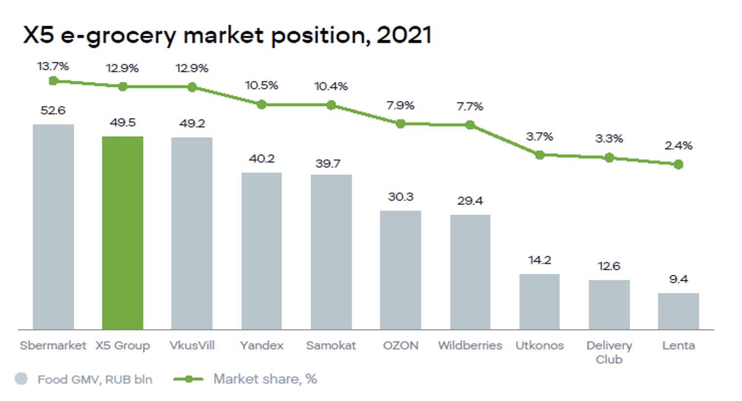 По данным Росстата, объем продовольственного розничного рынка РФ в 2021 году составил 18,1 трлн руб. Среди продовольственных ретейлеров у X5 первое место по выручке (12,7% в 2021 году) и второе место по количеству магазинов (20,2 тыс.) после «Магнита» (27,7 тыс.).