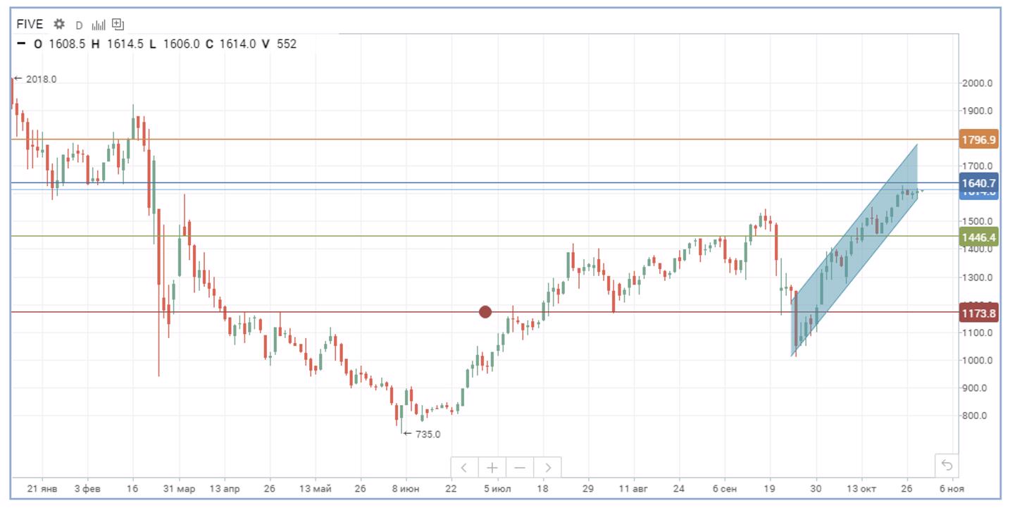 На дневном графике ГДР X5 на Мосбирже консолидируются около уровня сопротивления в районе «круглой» цифры 1600 руб. после сильного ралли. При пробитии 1640 руб. распискам может быть открыта дорога к уровню начала года в 1880 пунктов. В случае коррекции расписки могут снизиться к поддержке в 1450 пунктов, при дальнейшем углублении просадки возможен откат к 1170 руб.