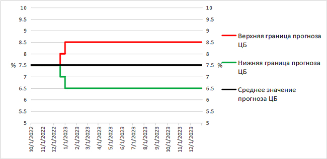 28 октября 2022 года ЦБ РФ оставил ключевую ставку без изменения на уровне 7,5% и представил обновленный прогноз по ее траектории. Средняя ключевая ставка в период с 31 октября до конца года прогнозируется в диапазоне 7,4-7,6%, что, по нашим оценкам, соответствует 7-8% на конец года (т.е. на последнем оставшемся до конца года заседании 16 декабря 2022 года ставка может остаться на уровне 7,5% или быть изменена на +/-0,5 п. п.). Прогнозы средней ключевой ставки на 2023-2025 годы остались без изменений: 6,5-8,5%, 6-7% и 5-6 % соответственно.