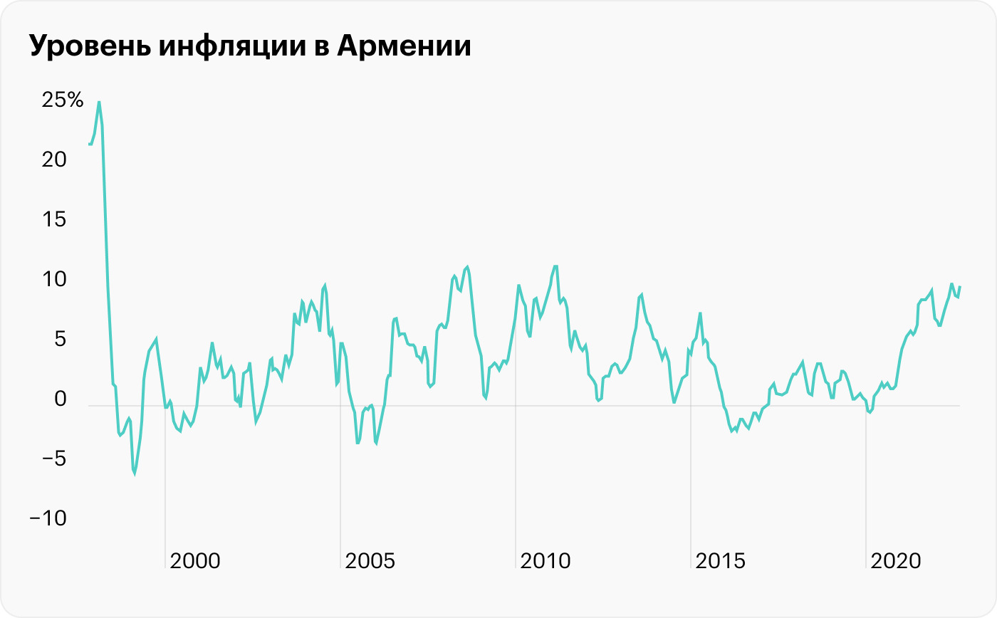 Инфляция в Армении высокая, в этом году она составляет 9,9%. В период 2018—2019 годов она была относительно низкой — около 3% в год. Но для страны характерны скачки инфляции до 9% и более, поэтому лучше ориентироваться на показатель инфляции 9%.